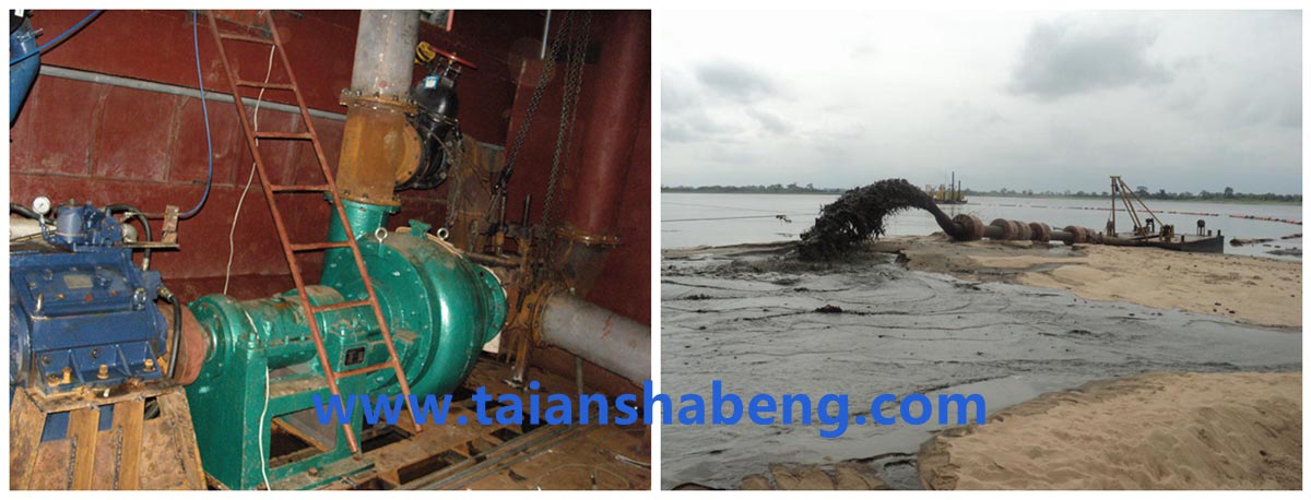 鹽城包老板在科特迪瓦搞工程,沙源及沙質(zhì)非常好,沙層松軟沒(méi)有板結(jié),也沒(méi)有大顆粒石子。在國(guó)內(nèi)制作了條射吸船,選用我們的350PNS-35的臥式泥沙泵,一小時(shí)出沙量達(dá)到300噸,輸送1200米。